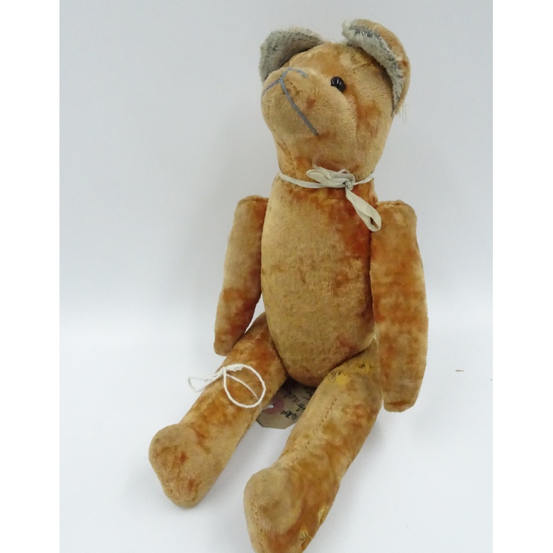 Arachide a orange velvet pin-jointed French teddy bear 1930s,with black glass eyes, pronounced muzzle with blue stitched nose and mouth, blue velvet ear lining, fixed neck and pin-jointed limbs 11in. (28cm.) high (two small holes to top of left leg and ank