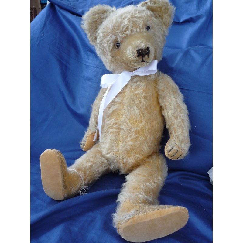 This is a Germany Teddy Baby. He is approximately 60 cms tall, fully jointed and stuffed with woodwool. He has a medium thick pile mostly in nice condition but there is wear to the backing fabric round the arm joints. I think the insteps of his large feet may have been in a shorter pile fabric too and that has worn off. There are card inserts in his feet. His large ears are sewn over the head and his mouth and nose stitching is original. An endearing feature is his original ‘cross eyes’ glass with painted backs.