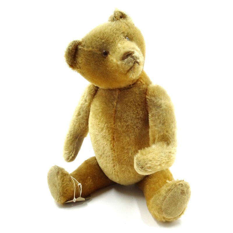 This adorable gold, blond coloured mohair teddy bear has amber glass eyes and a protruding snout, with horizontal brown nose and mouth. His felt paws and pads are good. His overall mohair coverage is excellent, with 99% or more of the mohair intact. He sta