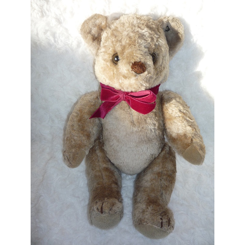 Is Tinge a Chad? Unlikely. He has an odd looking button back in his left ear, which is also visible behind his ear. His coat looks like sheepskin with no seams back or front. He is only 4 ways jointed. He only has 3 stitches to paws and claws which are light brown. He is a gorgeous old teddy bear with excellent fur coverage over his body. He is 12″ tall with slightly humped back and is from the 1940/50’s. A mystery bear.