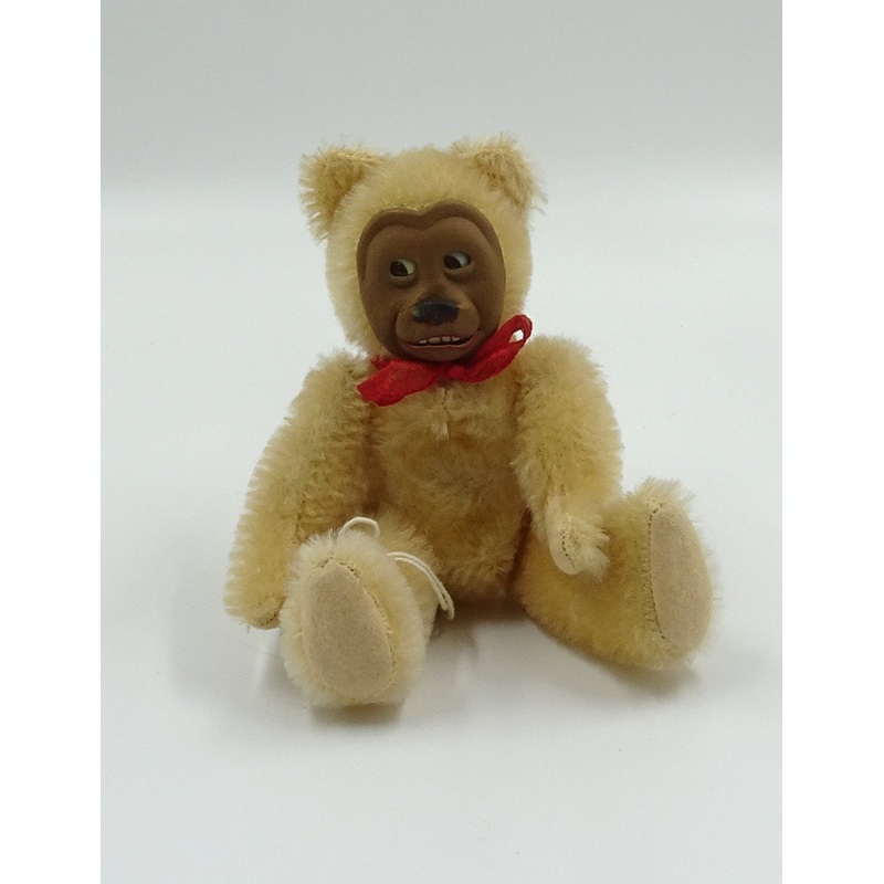 A rare mechanical Impex teddy bearwith golden mohair, hand painted rubber face, when tummy squeezed causes the bears eyes to go to the side and his tinplate tongue to protrude from tinplate teeth, swivel head, jointed limbs with felt pads and original ribb