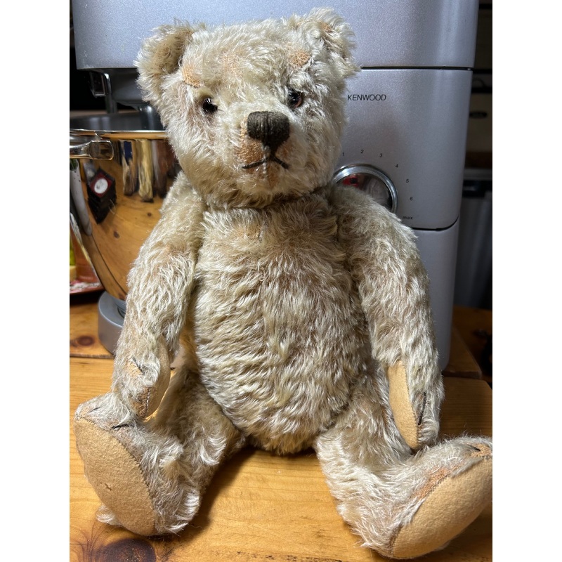 Straus is a Steiff "Original" teddy. This classic Steiff bear is made of wavy and dense, caramel blond mohair with glass eyes and felt paw pads. Traditionally filled with wood shavings, he is all original and unrestored. 14 ins high, he has felt pads and i