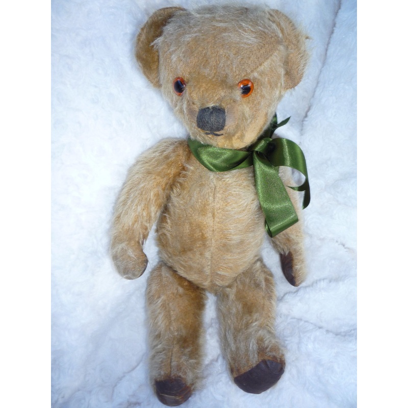 Sweet Old Loved Chad Valley Bear 15.5″ tall 1950’s at a guess Rexine pads in good condition, faded Royal Warrant Label to foot He is a strange old bear, I think he was found in an attic. Mohair is worn, a few bare patches to face, chest & arms, grubby in places He is definitely a well loved character bear with a strange, quirky face!!!!!There looks to be repair on his back. He is in strong, sound condition from what I can see.