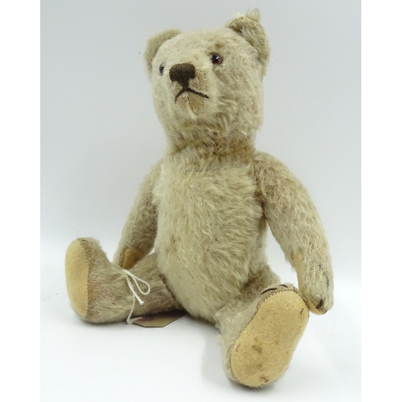 Ruskin a rare Steiff teddy bear with head movement,with beige mohair, brown backed glass eyes, brown stitched nose, mouth and claws, tail-operated rotating head mechanism, cream mohair front, jointed limbs with felt pads 10in. (25.5cm.) high (slight wear) – this bear was made only in 1955-1956 in 7 and 10 inches, 3539 examples were made during this time