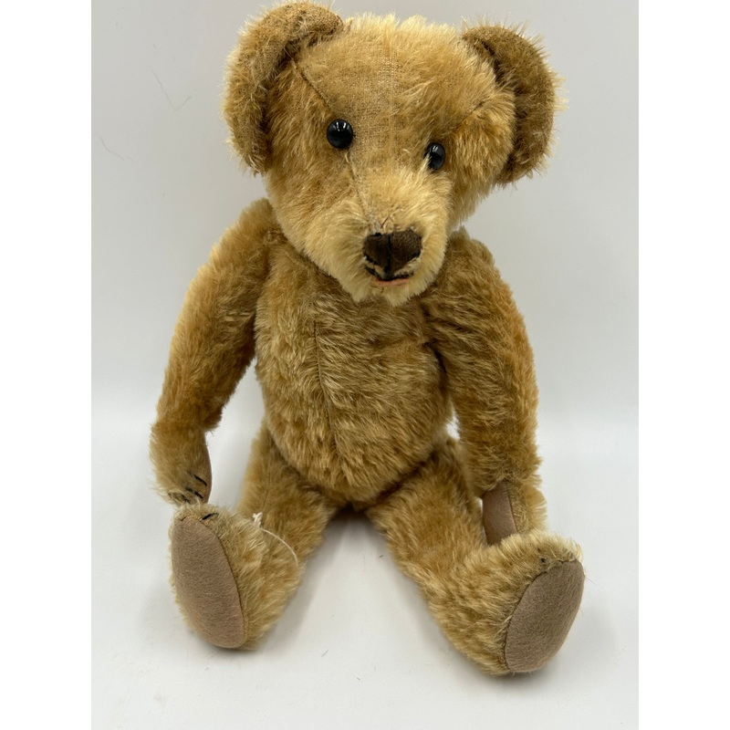 This early Harman teddy bearhas shoe button eyes, golden brown zigzag cloth nose, which appears to be original, three golden brown claws on feet (pads appear to be original) and the hands point upwards. Description Date 1910 Make Harman American Fabric Gol