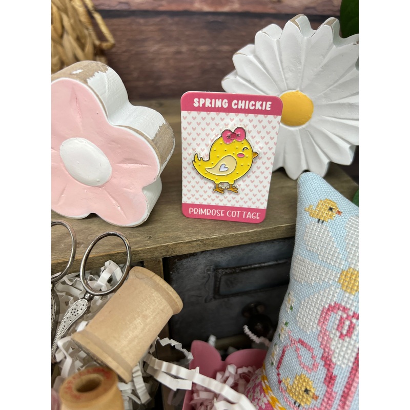Spring Chickie Needle Minder This needle minder keeps your needle safe and secure during all of your stitching sessions! Designed by Lindsey Weight of Primrose Cottage Enamel Needle Minder Approximate Size: 1.1" x 1.25"