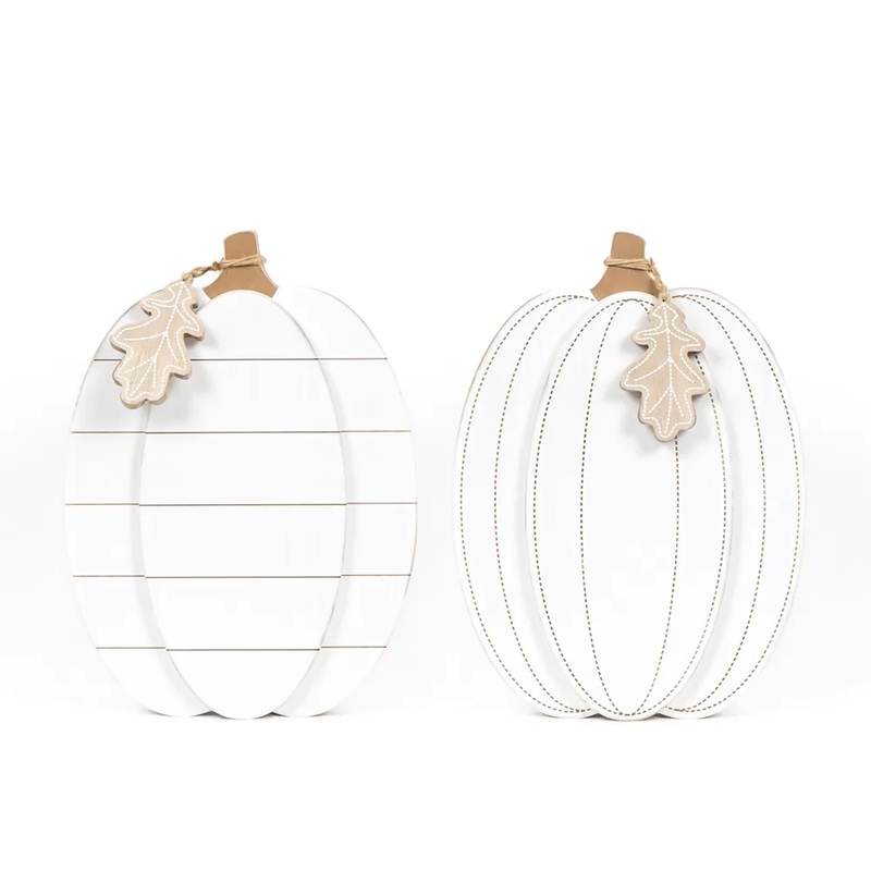 10x13x2 chunky wood cutout (PUMPKIN) white/natural - This neutral pumpkin includes a wooden leaf tag for all the extra details. Slightly on the heavier side, this chunky pumpkin will stand alone. Neutral colors to work with any dcor and last the whole Fall