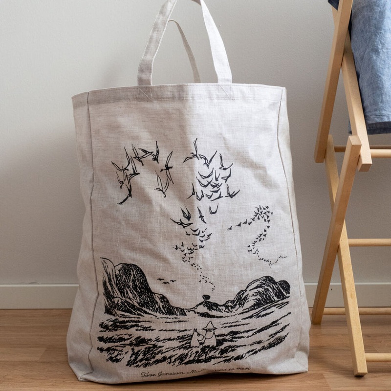 Store your laundry in a beautiful and easy-to-move linen laundry bag. Conveniently carry your laundry from boat or cottage to town. The large bag also makes a stylish recycling bag for bottles or cardboard. It has two handles and a drawstring top made of thinner cotton. The illustration on this product is an original drawing from the book Moominpappa at Sea. Size: 40 x 25 x 53 cm.