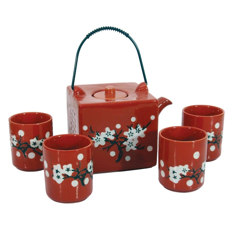 This beautiful tea set is perfect for enjoying your favourite tea in style. The teapot is decorated with stunning cherry blossom and calligraphy designs, while the four cups feature a lovely red and white colour scheme. The set is made from porcelain and m