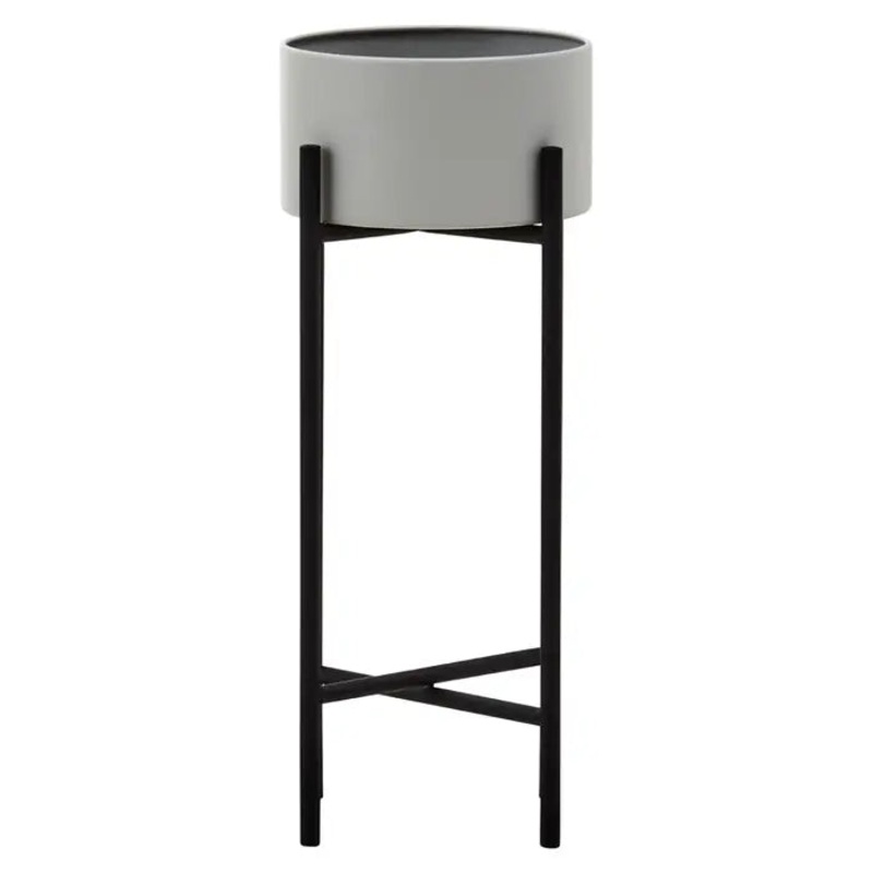The grey Trosa floor standing planters boast a minimal design. They have a contemporary design contrasted with a sleek and minimal black finish iron frame. The four legged frame features a crossed section, adding a touch of elegance to the overall design.