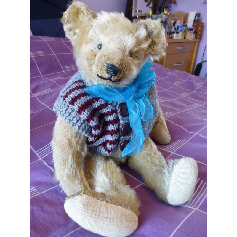 Showcased by Evelyn Chambers This is Albear he is a beautiful blond bear who is 14 ins tall He dates circa 1904-1908. He has a horizontal nose, boot button eyes and a good covering of mohair. Description Date 1904 Make Strunz Button Label Fabric Mohair whi