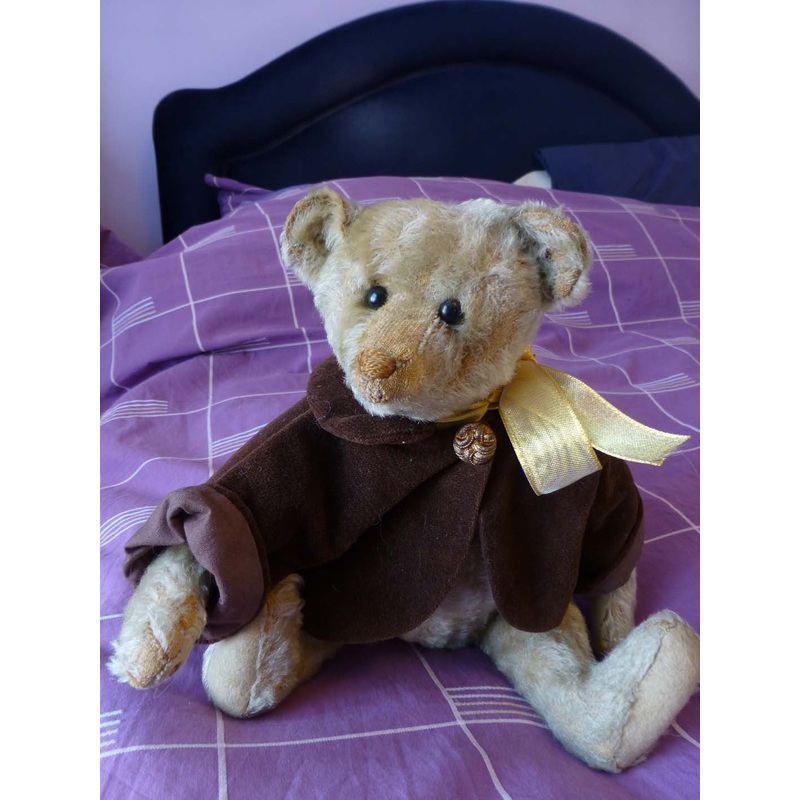 Showcased by Evelyn Chambers Precious is a lovely bear and is 13 inches tall. She is a Strunz who dates circa 1904-1908. She is white, with pale stitching, quite Steiff like and has boot button eyes and a good covering of mohair. She sports a velvet jacket