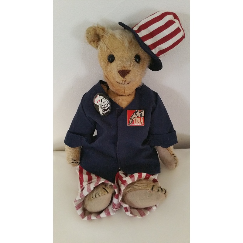 This chap is a quirky Ideal who is 13 tall with boot button eyes, fully jointed, wood wool stuffing throughout,and comes with whole outfit jacket trousers and badges Pads are original, mohair has loss to torso and back of head. He is wearing an Uncle Sam h