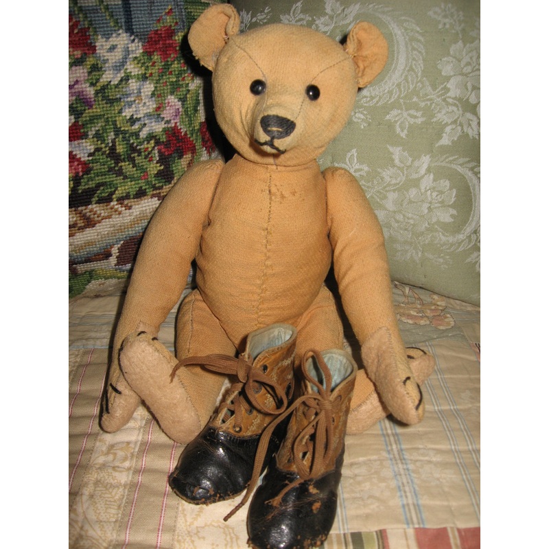 Here is my new baldSteiff Noel. Not a hair in sight! He dates from 1910.His Button is missing, but there is a mark where it would have been. He was once mohair, but now is totally bald! He is 14 ins tall with original shoe button eyesHe has extremely long arms, and an adorableface. He is fully jointed with recovered pads and woodwool stuffed. He sportsantique leather shoes that came with him.