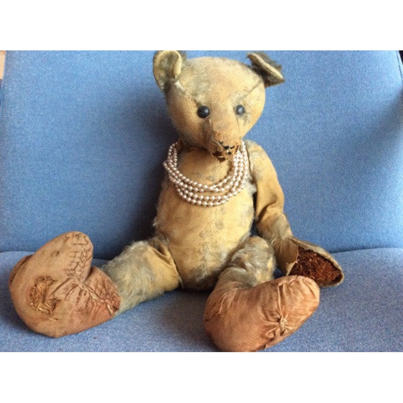 This is Brom. Brom is an antique Steiff teddybear from 1912.An old lady gave him to me two months ago. He belonged to her father as a child in 1912 and when she was a little girl, her father gave him to her. Now she is about 70 years old and because she was looking for a good home for Brom, she gave him to me for my collection.Brom is 42 cm, he has lost his arm a long time ago, he has no longer got his button in ear, but he has his original eyes and steals my heart.