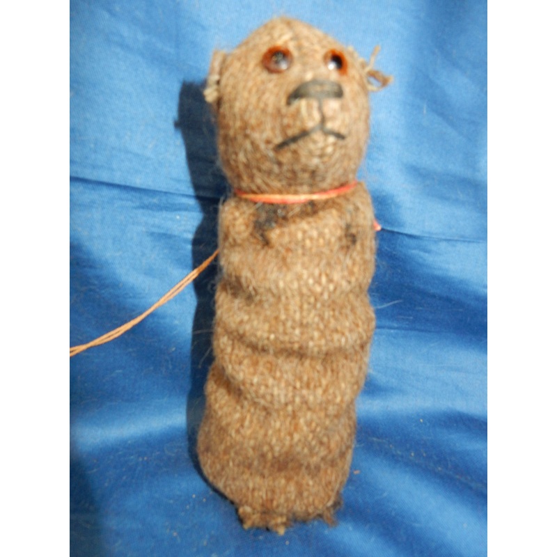 A very early bear. 1914 scarce long-voile Halloween bear which originally emitted a long squeak after pressing. He is a tiny 5 inches. His body is made from a spring. He has glass eyes and tiny ears and feet. A good horizontal nose and mouth. I can only im