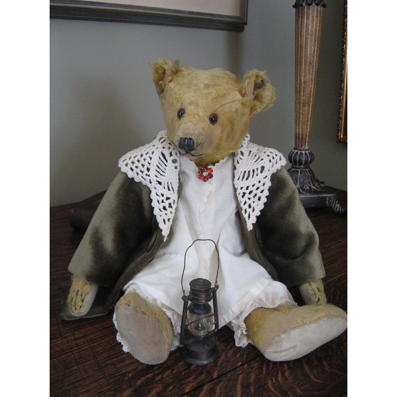 Florence the Lady with the Lamp! Showcased by Sue Howard Date: c1920 Florence is a lovely 16 ins golden mohair 1920 Steiff with her button. She has glass eyes, original features, wood wool stuffed and is fully jointed.She has anon working growler! She has