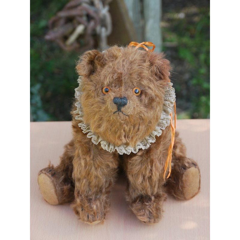 Stanley is a wonderful Steiff “Zottelbar” made in the 1920s. He has long shaggy brown mohair fur and is unjointed. These bears were designed to stand on all fours but over time and after being much cuddled Stanley’s stuffing has broken down in his tummy so he prefers to sit on his bottom (I love this!). He measures 13 inches long and 9 inches tall. He is entirely wood wool filled and has a non working side squeaker. His felt pads are in great condition and he has his original glass eyes. I have included a photo of him propped up to give an idea of how he would look standing. Stanley is such a sweetheart, he really is an adorable bear. He no longer has his button.
