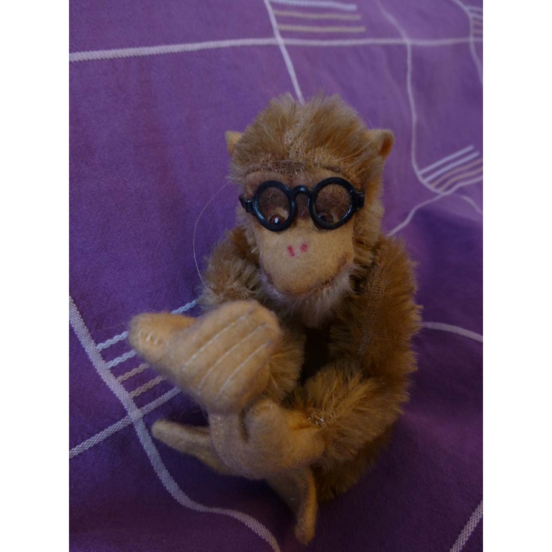 Showcased by Evelyn Chambers A 2 inch Bing monkey with a lovely brown coat, glass eyes and sporting his academic glasses to keep him top of the class! Small but perfectly formed, a little treasure. Description Date 1930 Make Bing Button Label Fabric Mohair